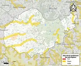 Le retrait-gonflement des sols argileux est susceptible d'engendrer des dommages importants aux bâtiments en cas d’alternance de périodes de sécheresse et de pluie. 14,6 % de la superficie communale est en aléa moyen ou fort (67,4 % au niveau départemental et 48,5 % au niveau national). Sur les 659 bâtiments dénombrés sur la commune en 2019, 40 sont en aléa moyen ou fort, soit 6 %, à comparer aux 81 % au niveau départemental et 54 % au niveau national. Une cartographie de l'exposition du territoire national au retrait gonflement des sols argileux est disponible sur le site du BRGM[22],[Carte 3].