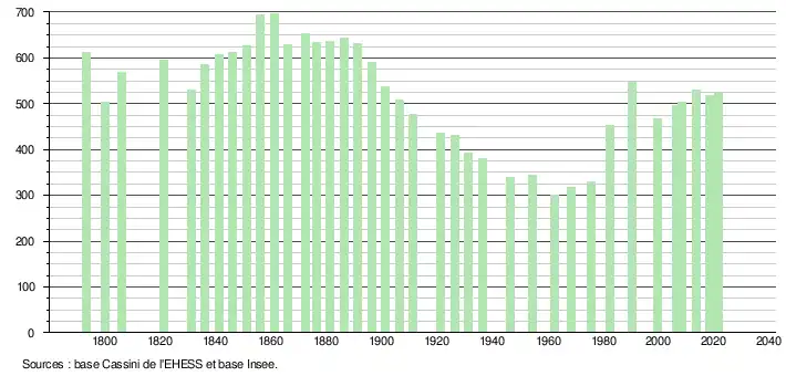 L'évolution du nombre d'habitants est connue à travers les recensements de la population effectués dans la commune depuis 1793. Pour les communes de moins de 10 000 habitants, une enquête de recensement portant sur toute la population est réalisée tous les cinq ans, les populations légales des années intermédiaires étant quant à elles estimées par interpolation ou extrapolation[20]. Pour la commune, le premier recensement exhaustif entrant dans le cadre du nouveau dispositif a été réalisé en 2008[21].