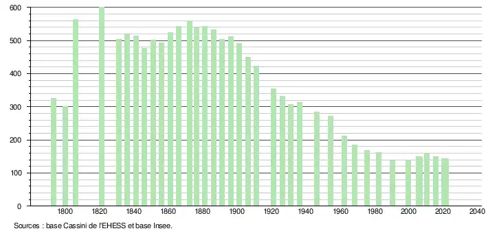 L'évolution du nombre d'habitants est connue à travers les recensements de la population effectués dans la commune depuis 1793. Pour les communes de moins de 10 000 habitants, une enquête de recensement portant sur toute la population est réalisée tous les cinq ans, les populations légales des années intermédiaires étant quant à elles estimées par interpolation ou extrapolation[14]. Pour la commune, le premier recensement exhaustif entrant dans le cadre du nouveau dispositif a été réalisé en 2005[15].