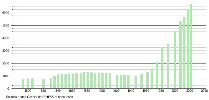 L'évolution du nombre d'habitants est connue à travers les recensements de la population effectués dans la commune depuis 1793. Pour les communes de moins de 10 000 habitants, une enquête de recensement portant sur toute la population est réalisée tous les cinq ans, les populations légales des années intermédiaires étant quant à elles estimées par interpolation ou extrapolation[24]. Pour la commune, le premier recensement exhaustif entrant dans le cadre du nouveau dispositif a été réalisé en 2007[25].