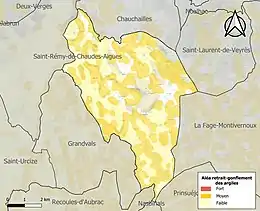 Le retrait-gonflement des sols argileux est susceptible d'engendrer des dommages importants aux bâtiments en cas d’alternance de périodes de sécheresse et de pluie. 53,6 % de la superficie communale est en aléa moyen ou fort (15,8 % au niveau départemental et 48,5 % au niveau national). Sur les 87 bâtiments dénombrés sur la commune en 2019, 43 sont en aléa moyen ou fort, soit 49 %, à comparer aux 14 % au niveau départemental et 54 % au niveau national. Une cartographie de l'exposition du territoire national au retrait gonflement des sols argileux est disponible sur le site du BRGM[31],[Carte 2].