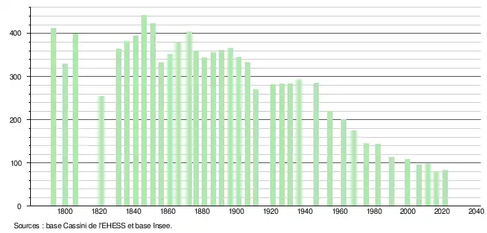 L'évolution du nombre d'habitants est connue à travers les recensements de la population effectués dans la commune depuis 1793. Pour les communes de moins de 10 000 habitants, une enquête de recensement portant sur toute la population est réalisée tous les cinq ans, les populations légales des années intermédiaires étant quant à elles estimées par interpolation ou extrapolation[39]. Pour la commune, le premier recensement exhaustif entrant dans le cadre du nouveau dispositif a été réalisé en 2006[40].