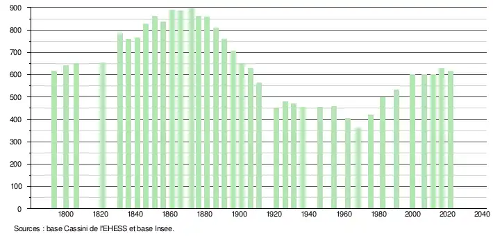 L'évolution du nombre d'habitants est connue à travers les recensements de la population effectués dans la commune depuis 1793. Pour les communes de moins de 10 000 habitants, une enquête de recensement portant sur toute la population est réalisée tous les cinq ans, les populations légales des années intermédiaires étant quant à elles estimées par interpolation ou extrapolation[14]. Pour la commune, le premier recensement exhaustif entrant dans le cadre du nouveau dispositif a été réalisé en 2006[15].