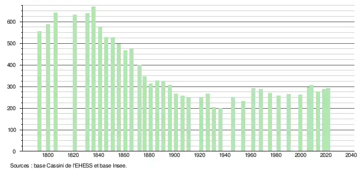 L'évolution du nombre d'habitants est connue à travers les recensements de la population effectués dans la commune depuis 1793. Pour les communes de moins de 10 000 habitants, une enquête de recensement portant sur toute la population est réalisée tous les cinq ans, les populations légales des années intermédiaires étant quant à elles estimées par interpolation ou extrapolation[29]. Pour la commune, le premier recensement exhaustif entrant dans le cadre du nouveau dispositif a été réalisé en 2008[30].