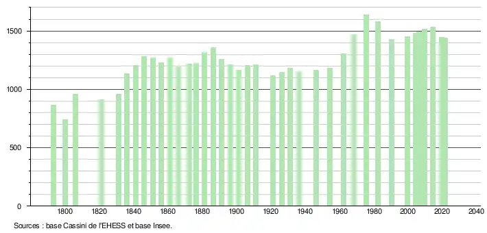 L'évolution du nombre d'habitants est connue à travers les recensements de la population effectués dans la commune depuis 1793. Pour les communes de moins de 10 000 habitants, une enquête de recensement portant sur toute la population est réalisée tous les cinq ans, les populations légales des années intermédiaires étant quant à elles estimées par interpolation ou extrapolation[24]. Pour la commune, le premier recensement exhaustif entrant dans le cadre du nouveau dispositif a été réalisé en 2004[25].