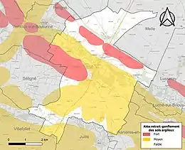 Les mouvements de terrains susceptibles de se produire sur la commune sont des tassements différentiels[17]. Le retrait-gonflement des sols argileux est susceptible d'engendrer des dommages importants aux bâtiments en cas d’alternance de périodes de sécheresse et de pluie[18]. 64,1 % de la superficie communale est en aléa moyen ou fort (54,9 % au niveau départemental et 48,5 % au niveau national)[Carte 2]. Depuis le , en application de la loi ELAN, différentes contraintes s'imposent aux vendeurs, maîtres d'ouvrages ou constructeurs de biens situés dans une zone classée en aléa moyen ou fort[Note 2],[19].