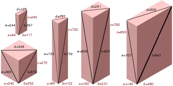 Par exemple, le triplet pythagoricien minimal (3, 4, 5) fournit la brique minimale (44, 117, 240).