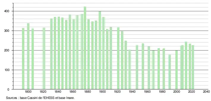 L'évolution du nombre d'habitants est connue à travers les recensements de la population effectués dans la commune depuis 1793. Pour les communes de moins de 10 000 habitants, une enquête de recensement portant sur toute la population est réalisée tous les cinq ans, les populations légales des années intermédiaires étant quant à elles estimées par interpolation ou extrapolation[18]. Pour la commune, le premier recensement exhaustif entrant dans le cadre du nouveau dispositif a été réalisé en 2007[19].