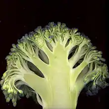 À fort grossissement et en effectuant une coupe, on peut observer les fleurs du brocoli qui selon leur position dans l'inflorescence sont en boutons ou parfois pratiquement écloses. C'est la couleur des pétales qui donne à la pomme de brocoli mature sa couleur parfois jaune et parfois d'un beau bleu[4].