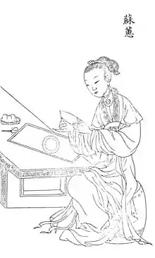 L'art de la broderie fut pratiqué, en Chine, par des femmes, quel que soit leur rang au sein de la société chinoise, et par des hommes. Tous étaient nommés « les gens de la fenêtre verte »[3]. L'une des brodeuses les plus célèbres se nomme Han Ximeng, de l'école Gu. Ting Pei et Shen Zhou, qui vécurent au XIXe siècle, sont deux hommes très connus en Chine, dans cet art[4].
