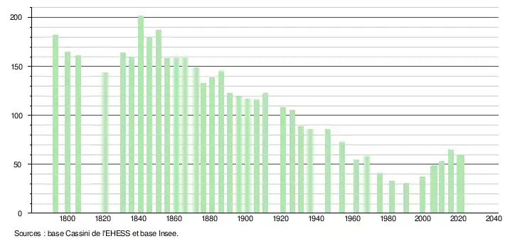 L'évolution du nombre d'habitants est connue à travers les recensements de la population effectués dans la commune depuis 1793. Pour les communes de moins de 10 000 habitants, une enquête de recensement portant sur toute la population est réalisée tous les cinq ans, les populations légales des années intermédiaires étant quant à elles estimées par interpolation ou extrapolation[15]. Pour la commune, le premier recensement exhaustif entrant dans le cadre du nouveau dispositif a été réalisé en 2005[16].