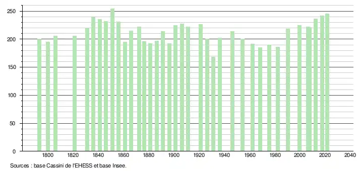 L'évolution du nombre d'habitants est connue à travers les recensements de la population effectués dans la commune depuis 1793. Pour les communes de moins de 10 000 habitants, une enquête de recensement portant sur toute la population est réalisée tous les cinq ans, les populations légales des années intermédiaires étant quant à elles estimées par interpolation ou extrapolation[33]. Pour la commune, le premier recensement exhaustif entrant dans le cadre du nouveau dispositif a été réalisé en 2007[34].