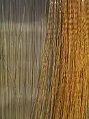 Les fibres ou filaments constituent les matières de garnissage[8]. Les fibres sont généralement pliées en deux pour former une touffe, la partie visible des touffes est appelée la sortie[9]. Les touffes sont aussi nommées loquets ou pions[9], mouchet en Suisse[10],[11]. L'implantation des fibres sur le support (la disposition des rangs de touffes) peut être : parallèle, en quinconce, sur une, deux ou plusieurs faces, en hélice, en chevron.
