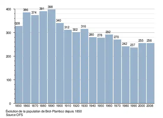 Le graphique suivant résume l'évolution de la population de Brot-Plamboz entre 1850 et 2008[4] :