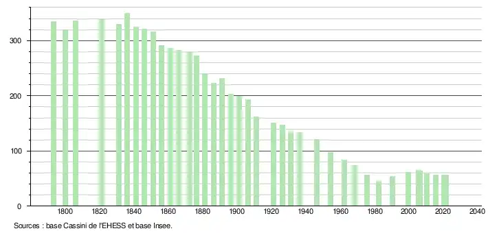L'évolution du nombre d'habitants est connue à travers les recensements de la population effectués dans la commune depuis 1793. Pour les communes de moins de 10 000 habitants, une enquête de recensement portant sur toute la population est réalisée tous les cinq ans, les populations légales des années intermédiaires étant quant à elles estimées par interpolation ou extrapolation[16]. Pour la commune, le premier recensement exhaustif entrant dans le cadre du nouveau dispositif a été réalisé en 2005[17].