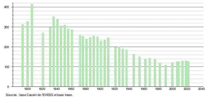 L'évolution du nombre d'habitants est connue à travers les recensements de la population effectués dans la commune depuis 1793. Pour les communes de moins de 10 000 habitants, une enquête de recensement portant sur toute la population est réalisée tous les cinq ans, les populations légales des années intermédiaires étant quant à elles estimées par interpolation ou extrapolation[17]. Pour la commune, le premier recensement exhaustif entrant dans le cadre du nouveau dispositif a été réalisé en 2008[18].
