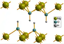 La brucite est le corps chimique minéral naturel composé ionique des cations magnésium Mg2+ et des anions hydroxyles OH−, soit l'hydroxyde de magnésium de formule chimique Mg(OH)2.