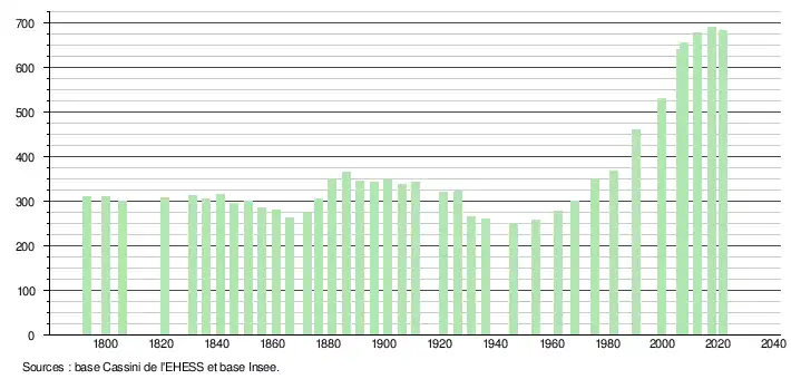 L'évolution du nombre d'habitants est connue à travers les recensements de la population effectués dans la commune depuis 1793. Pour les communes de moins de 10 000 habitants, une enquête de recensement portant sur toute la population est réalisée tous les cinq ans, les populations légales des années intermédiaires étant quant à elles estimées par interpolation ou extrapolation[22]. Pour la commune, le premier recensement exhaustif entrant dans le cadre du nouveau dispositif a été réalisé en 2007[23].