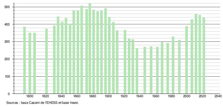 L'évolution du nombre d'habitants est connue à travers les recensements de la population effectués dans la commune depuis 1793. Pour les communes de moins de 10 000 habitants, une enquête de recensement portant sur toute la population est réalisée tous les cinq ans, les populations légales des années intermédiaires étant quant à elles estimées par interpolation ou extrapolation[18]. Pour la commune, le premier recensement exhaustif entrant dans le cadre du nouveau dispositif a été réalisé en 2006[19].