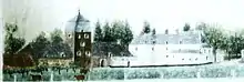 Les maisons du village se tassent autour de l'église. Celle-ci n'a rien à voir avec l'actuelle et semble disposer d'une tour attenante à la nef et coiffé d'ardoise. Le chœur est éclairé sur son flanc nord par deux lancettes, son chevet plat est percé de deux autres baies qui surmonte, au niveau du pignon, un oculus.