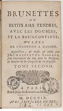 Le genre, tendre et léger, est notamment popularisé par l'éditeur parisien Christophe Ballard, qui publie au XVIIIe siècle de nombreux recueils de brunettes[5] (trois volumes de Brunettes ou petits airs tendres, avec les doubles et la Basse-Continue ; mêlées de Chansons à danser, en 1703, 1704 et 1711[1]). De forme, il se rattache à la forme binaire de l'air de cour et à celle de la chanson avec refrain[5].