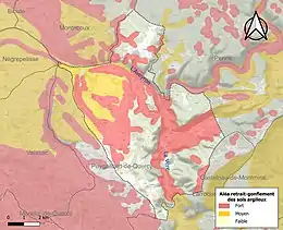 Le retrait-gonflement des sols argileux est susceptible d'engendrer des dommages importants aux bâtiments en cas d’alternance de périodes de sécheresse et de pluie. 54,6 % de la superficie communale est en aléa moyen ou fort (92 % au niveau départemental et 48,5 % au niveau national). Sur les 483 bâtiments dénombrés sur la commune en 2019, 383 sont en aléa moyen ou fort, soit 79 %, à comparer aux 96 % au niveau départemental et 54 % au niveau national. Une cartographie de l'exposition du territoire national au retrait gonflement des sols argileux est disponible sur le site du BRGM[43],[Carte 3].