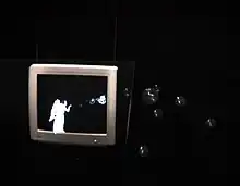 • Mais,...l'ange (1999) : Cette œuvre présentée dans le cadre des manifestations numériques à Montbéliard[5] met en scène l'image d'un ange, grâce au dispositif de théâtre optique, soufflant des bulles virtuelles. Lorsque ces bulles s'échappent du cadre de la projection, elles deviennent réelles et offrent le loisir au visiteur de jouer avec elles... "mais,...l'ange" invite à une réflexion sur la perméabilité des niveaux de représentation entre le réel et le virtuel.