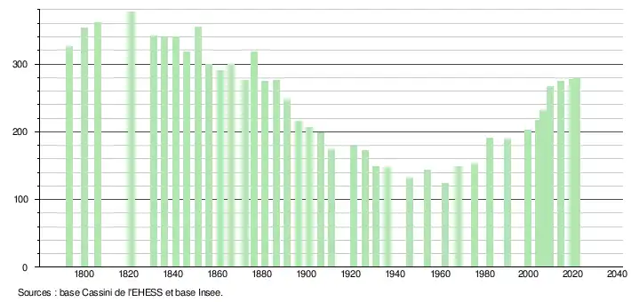 L'évolution du nombre d'habitants est connue à travers les recensements de la population effectués dans la commune depuis 1793. Pour les communes de moins de 10 000 habitants, une enquête de recensement portant sur toute la population est réalisée tous les cinq ans, les populations légales des années intermédiaires étant quant à elles estimées par interpolation ou extrapolation[23]. Pour la commune, le premier recensement exhaustif entrant dans le cadre du nouveau dispositif a été réalisé en 2004[24].