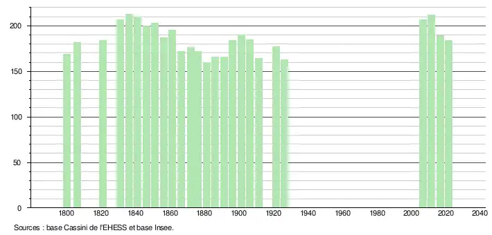 L'évolution du nombre d'habitants est connue à travers les recensements de la population effectués dans la commune depuis 1800. Pour les communes de moins de 10 000 habitants, une enquête de recensement portant sur toute la population est réalisée tous les cinq ans, les populations légales des années intermédiaires étant quant à elles estimées par interpolation ou extrapolation[20]. Pour la commune, le premier recensement exhaustif entrant dans le cadre du nouveau dispositif a été réalisé en 2006[21].