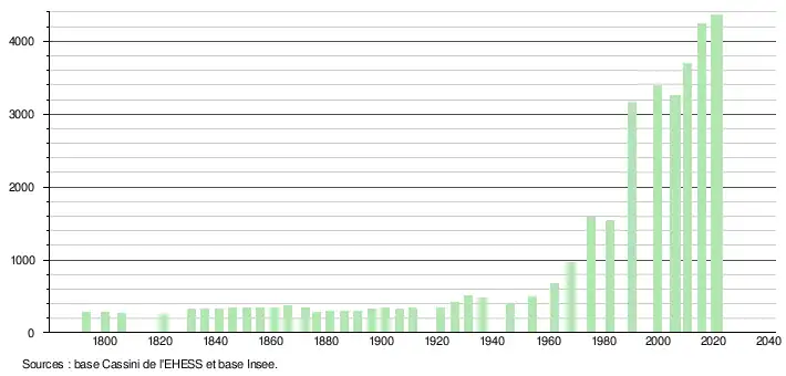 L'évolution du nombre d'habitants est connue à travers les recensements de la population effectués dans la commune depuis 1793. Pour les communes de moins de 10 000 habitants, une enquête de recensement portant sur toute la population est réalisée tous les cinq ans, les populations légales des années intermédiaires étant quant à elles estimées par interpolation ou extrapolation[36]. Pour la commune, le premier recensement exhaustif entrant dans le cadre du nouveau dispositif a été réalisé en 2005[37].