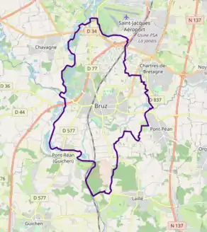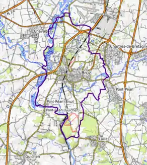 Dans le sens des aiguilles d’une montre, les communes limitrophes sont en partant du nord : Saint-Jacques-de-la-Lande, Chartres-de-Bretagne, Pont-Péan, Laillé, Guichen, Goven et Chavagne.