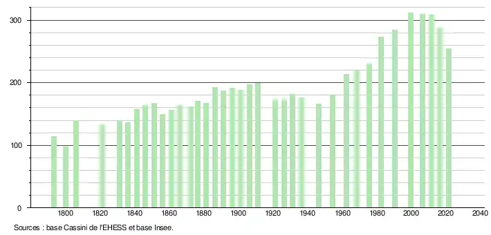 L'évolution du nombre d'habitants est connue à travers les recensements de la population effectués dans la commune depuis 1793. Pour les communes de moins de 10 000 habitants, une enquête de recensement portant sur toute la population est réalisée tous les cinq ans, les populations légales des années intermédiaires étant quant à elles estimées par interpolation ou extrapolation[15]. Pour la commune, le premier recensement exhaustif entrant dans le cadre du nouveau dispositif a été réalisé en 2006[16].