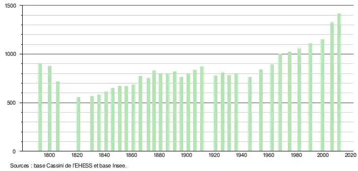 L'évolution du nombre d'habitants est connue à travers les recensements de la population effectués dans la commune depuis 1793. À partir du , les populations légales des communes sont publiées annuellement dans le cadre d'un recensement qui repose désormais sur une collecte d'information annuelle, concernant successivement tous les territoires communaux au cours d'une période de cinq ans. Pour les communes de moins de 10 000 habitants, une enquête de recensement portant sur toute la population est réalisée tous les cinq ans, les populations légales des années intermédiaires étant quant à elles estimées par interpolation ou extrapolation[3]. Pour la commune, le premier recensement exhaustif entrant dans le cadre du nouveau dispositif a été réalisé en 2006[4],[Note 1].