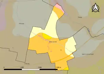 Par ailleurs le sol du territoire communal peut faire l'objet de mouvements de terrain liés à la sécheresse. Le phénomène de retrait-gonflement des argiles est la conséquence d'un changement d'humidité des sols argileux. Les argiles sont capables de fixer l'eau disponible mais aussi de la perdre en se rétractant en cas de sécheresse[39]. Ce phénomène peut provoquer des dégâts très importants sur les constructions (fissures, déformations des ouvertures) pouvant rendre inhabitables certains locaux. Celui-ci a particulièrement affecté le Loiret après la canicule de l'été 2003. Une grande partie sud du territoire de la commune est soumise à un aléa « moyen » face à ce risque, selon l'échelle définie par le Bureau de recherches géologiques et minières (BRGM), une poche étant même en aléa « fort »[40].