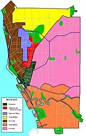 Buffalo compte de nombreux descendants d'Italiens, Polonais, Irlandais, Allemands, Grecs, Arabes, Juifs, Indiens, Macédoniens, Portoricains et Africains. La plupart des quartiers ethniques existent encore, les Irlando-Américains vivent dans le sud de Buffalo, les Afro-Américains dans l'East Side, et à un certain point les Italo-Américains dans le West Side. Le West Side est devenu un melting pot de toutes les ethnies, les cultures italienne et latino ayant la plus grande influence.[réf. nécessaire]