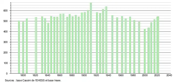 L'évolution du nombre d'habitants est connue à travers les recensements de la population effectués dans la commune depuis 1793. Pour les communes de moins de 10 000 habitants, une enquête de recensement portant sur toute la population est réalisée tous les cinq ans, les populations légales des années intermédiaires étant quant à elles estimées par interpolation ou extrapolation[30]. Pour la commune, le premier recensement exhaustif entrant dans le cadre du nouveau dispositif a été réalisé en 2005[31].