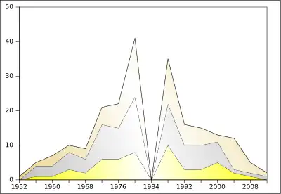 Évolution du nombre de médailles gagnées par la Bulgarie aux Jeux olympiques d'été.