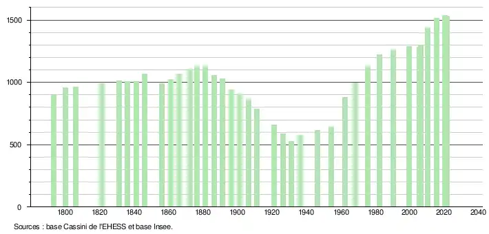 L'évolution du nombre d'habitants est connue à travers les recensements de la population effectués dans la commune depuis 1793. Pour les communes de moins de 10 000 habitants, une enquête de recensement portant sur toute la population est réalisée tous les cinq ans, les populations légales des années intermédiaires étant quant à elles estimées par interpolation ou extrapolation[20]. Pour la commune, le premier recensement exhaustif entrant dans le cadre du nouveau dispositif a été réalisé en 2005[21].