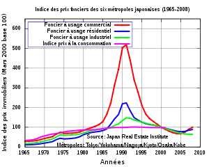 Avec une économie gouvernée par des taux d'investissement très élevés, le krach a été particulièrement dur[16]. Les investissements se sont détournés du pays, les entreprises manufacturières perdant une partie de leur avance technologique. Les produits japonais devenant moins compétitifs à l'exportation, le faible taux de consommation des ménages japonais a pesé sur l'économie causant une spirale déflationniste[17]. La banque centrale japonaise a dû baisser ses taux directeurs vers zéro[18]. Le fait que cette politique de création monétaire très accommodante n'ait pas réussi à arrêter la déflation a conduit des économistes comme Paul Krugman ainsi que des hommes politiques japonais à suggérer une politique de ciblage d'inflation[19].