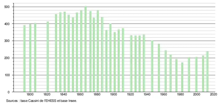 L'évolution du nombre d'habitants est connue à travers les recensements de la population effectués dans la commune depuis 1793. À partir du , les populations légales des communes sont publiées annuellement dans le cadre d'un recensement qui repose désormais sur une collecte d'information annuelle, concernant successivement tous les territoires communaux au cours d'une période de cinq ans. Pour les communes de moins de 10 000 habitants, une enquête de recensement portant sur toute la population est réalisée tous les cinq ans, les populations légales des années intermédiaires étant quant à elles estimées par interpolation ou extrapolation[8]. Pour la commune, le premier recensement exhaustif entrant dans le cadre du nouveau dispositif a été réalisé en 2007[9],[Note 1].