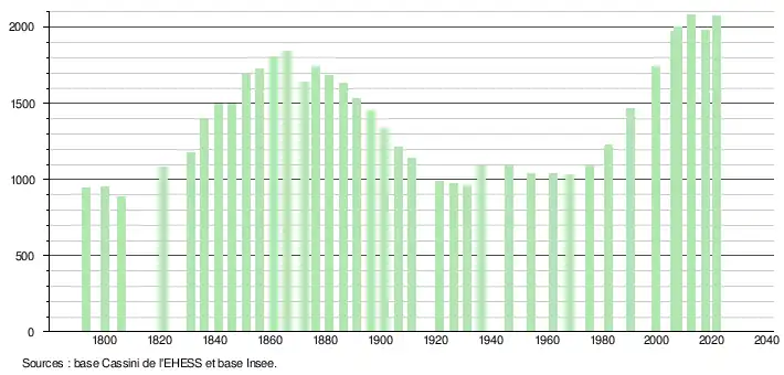 L'évolution du nombre d'habitants est connue à travers les recensements de la population effectués dans la commune depuis 1793. Pour les communes de moins de 10 000 habitants, une enquête de recensement portant sur toute la population est réalisée tous les cinq ans, les populations légales des années intermédiaires étant quant à elles estimées par interpolation ou extrapolation[23]. Pour la commune, le premier recensement exhaustif entrant dans le cadre du nouveau dispositif a été réalisé en 2007[24].