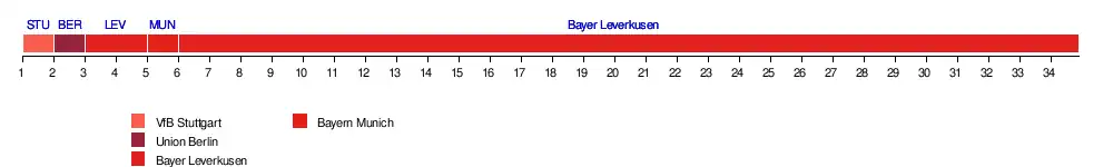 | Leverkusen | 5 | 3 | 1 | 1 | 2 | 1 | 1 | 1 | 1 | 1 | 1 | 1 | 2 | 1 | 1 | 1 | 1 | 1 | 1 | 1 | 1 | 1 | 1 | 1 | 1 | 1 | 1 | 1 | 1 | 1 | 1 | 1 | 1 | 1 | 30 | - | - |