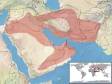 Cette espèce se rencontre en Syrie, en Jordanie, en Arabie saoudite, en Oman, aux Émirats arabes unis, au Koweït, en Irak, en Iran, dans l'Est du Pakistan, en Afghanistan et dans le Sud du Turkménistan[1].
