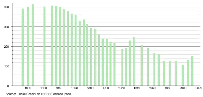- Dans le tableau des recensements et le graphique, par convention dans Wikipédia, le principe a été retenu, pour les populations légales postérieures à 1999 de n’afficher dans le tableau des recensements et le graphique que les populations correspondant à l'année 2006, première population légale publiée calculée conformément aux concepts définis dans le décret no 2003-485 du 5 juin 2003, et les années correspondant à une enquête exhaustive de recensement pour les communes de moins de 10 000 habitants, ainsi que la dernière population légale publiée par l’Insee.