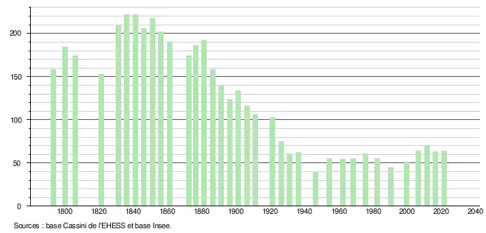L'évolution du nombre d'habitants est connue à travers les recensements de la population effectués dans la commune depuis 1793. Pour les communes de moins de 10 000 habitants, une enquête de recensement portant sur toute la population est réalisée tous les cinq ans, les populations légales des années intermédiaires étant quant à elles estimées par interpolation ou extrapolation[16]. Pour la commune, le premier recensement exhaustif entrant dans le cadre du nouveau dispositif a été réalisé en 2006[17].