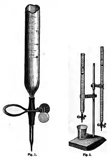 Une burette est un instrument de laboratoire permettant d'ajouter au goutte-à-goutte un réactif dont le volume (de l'ordre de 1 à 25 mL) doit être connu. C'est le cas lors d'un titrage volumétrique.