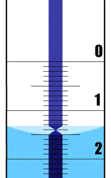 La lecture de la graduation se fait généralement en bas du ménisque, sauf pour des composés très colorés, comme les solutions de permanganate de potassium. La lecture est alors en haut du ménisque. Certaines burette sont munies d'une barre bleue à l'arrière de la graduation; Le ménisque crée, par effet d'optique, une pointe qui permet de lire précisément la valeur du volume. Dans ce cas, cette technique de lecture doit être utilisée à la fois pour ajuster le zéro et pour lire les volumes.