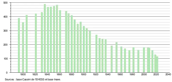L'évolution du nombre d'habitants est connue à travers les recensements de la population effectués dans la commune depuis 1793. Pour les communes de moins de 10 000 habitants, une enquête de recensement portant sur toute la population est réalisée tous les cinq ans, les populations légales des années intermédiaires étant quant à elles estimées par interpolation ou extrapolation[17]. Pour la commune, le premier recensement exhaustif entrant dans le cadre du nouveau dispositif a été réalisé en 2008[18].