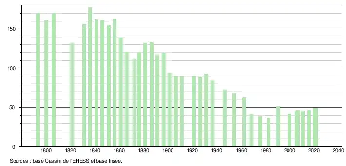 L'évolution du nombre d'habitants est connue à travers les recensements de la population effectués dans la commune depuis 1793. Pour les communes de moins de 10 000 habitants, une enquête de recensement portant sur toute la population est réalisée tous les cinq ans, les populations légales des années intermédiaires étant quant à elles estimées par interpolation ou extrapolation[19]. Pour la commune, le premier recensement exhaustif entrant dans le cadre du nouveau dispositif a été réalisé en 2005[20].