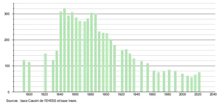 L'évolution du nombre d'habitants est connue à travers les recensements de la population effectués dans la commune depuis 1793. Pour les communes de moins de 10 000 habitants, une enquête de recensement portant sur toute la population est réalisée tous les cinq ans, les populations légales des années intermédiaires étant quant à elles estimées par interpolation ou extrapolation[43]. Pour la commune, le premier recensement exhaustif entrant dans le cadre du nouveau dispositif a été réalisé en 2006[44].